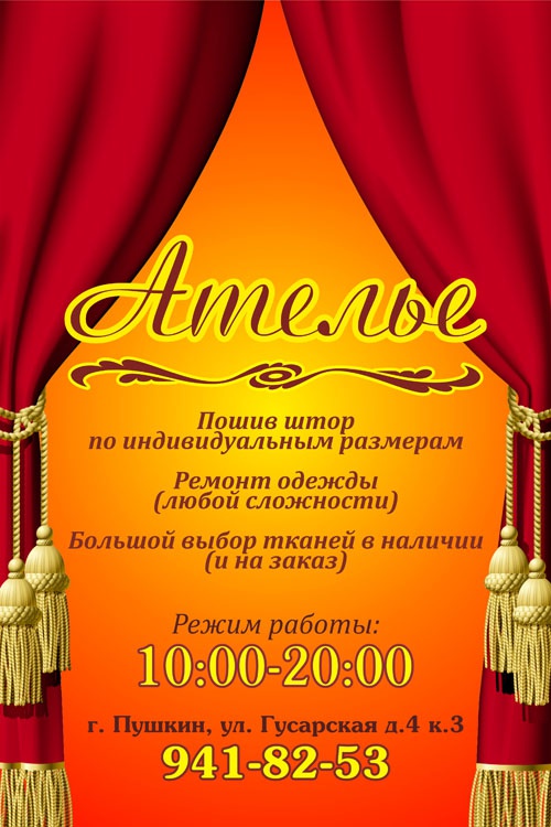 На улице Гусарской, в городе Пушкин, работает ателье, предлагающее жителям города качественные услуги по ремонту мужской, женской и детской одежды: