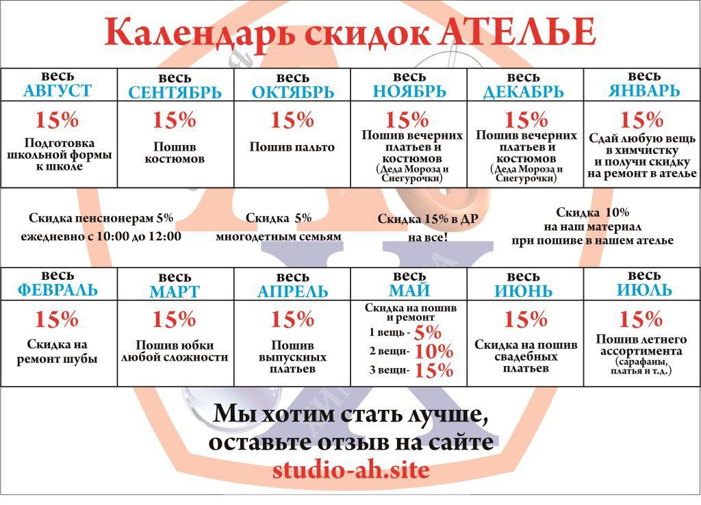 - Июль: скидка 15% на пошив летней одежды (сарафаны, платья и т. д.)